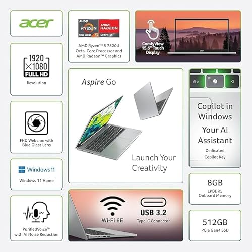 acer Aspire Go 15.6" Full HD FHD IPS Touch Screen Laptop, AMD Ryzen 5-7520U Quad-Core Processor | 8GB LPDDR5 | 512GB NVMe SSD | | Wi-Fi 6 | Windows 11...